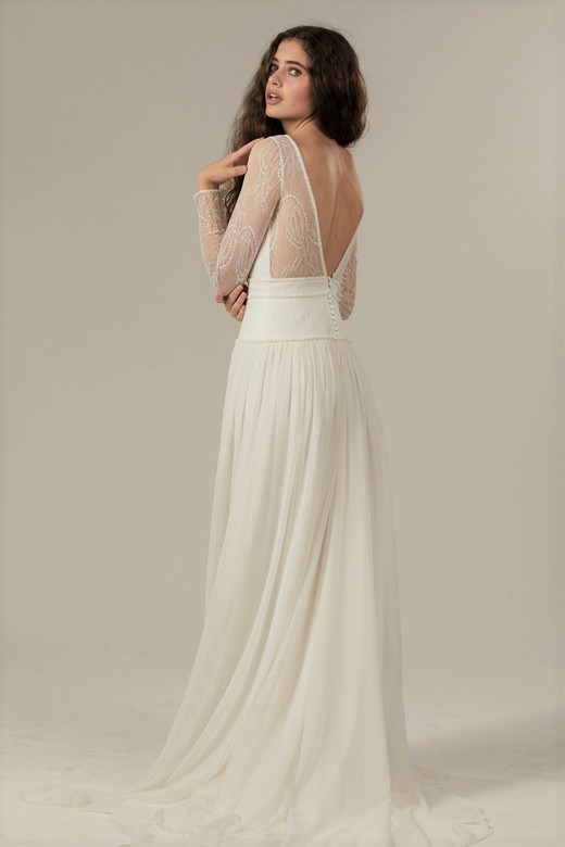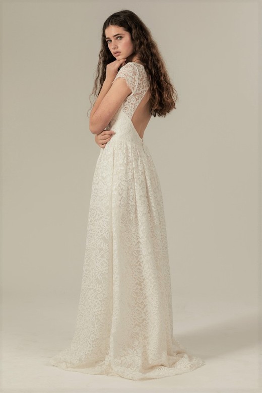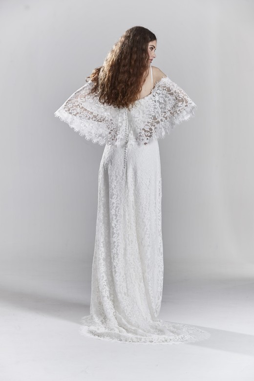 A sleek, slimline silhouette, low back and transparent side panels offset the demure neck line and slim lace straps. A gently flared fantail train and lace detailing give this gown a clean and crisp look.