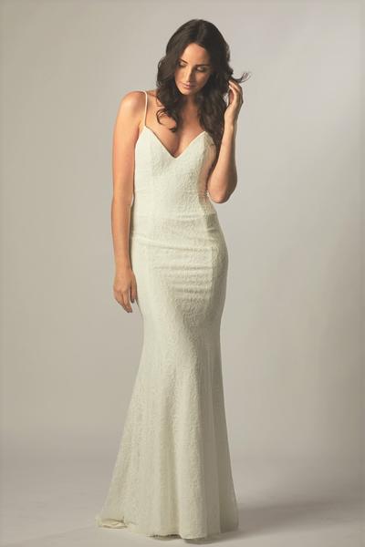 This sheath dress moves beautifully as you walk. At the back, separate layers of wattau train, lace trail, and Grecian draping make for an incredibly glamorous journey down the aisle.