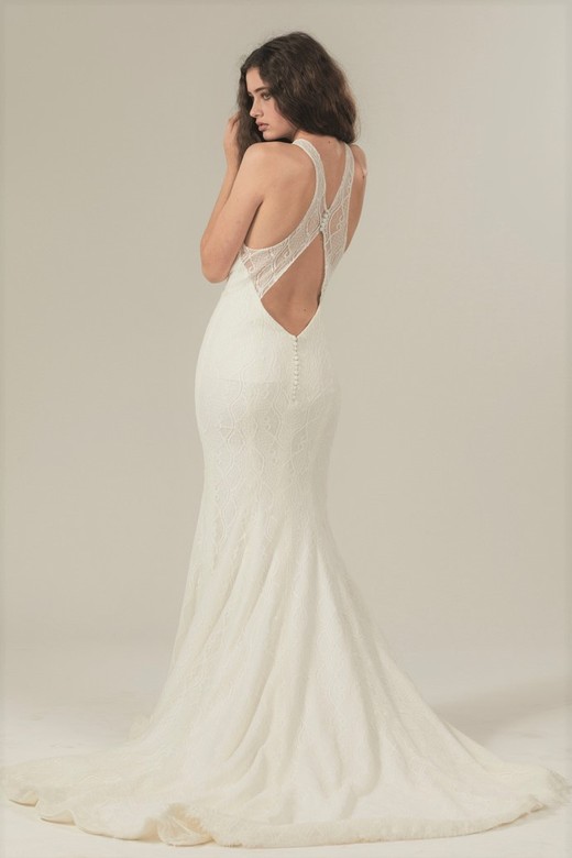 The bodice features a high halter neck and button back – this can be left open for a relaxed, boho feel, or closed for more structure and support. Italian baroque lace and full boning mean it's surprisingly flattering and supportive, even for a larger bust.